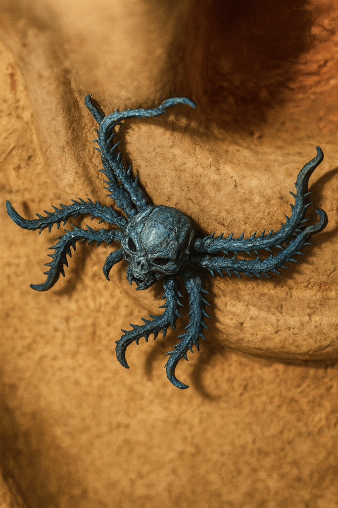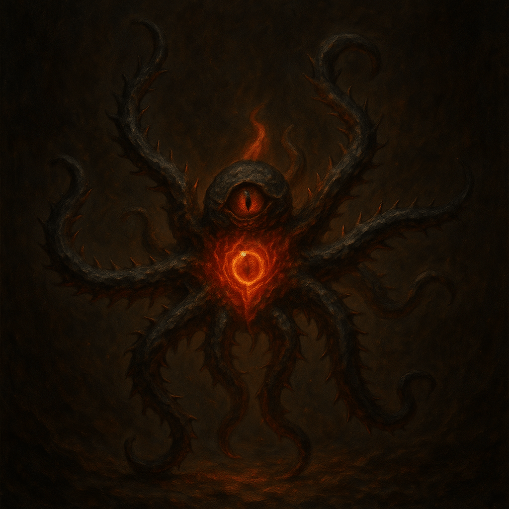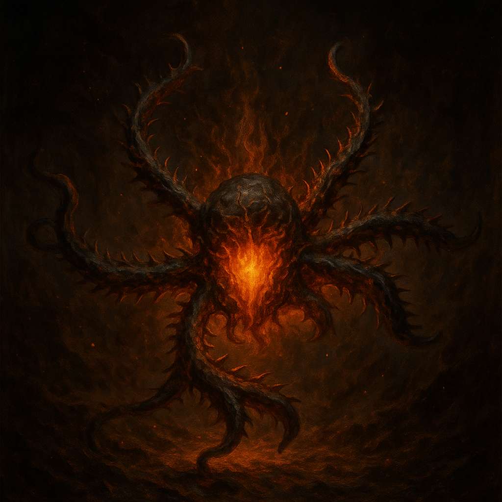 I denna form uppenbarar sig Sirtha-Ka inte som en mänsklig gestalt, utan som den första eldvarelsen, född i djupet av jordens skälvande inre – där värmen möter mörkret. Hennes kropp består av eldförhårdnat mineral, kluven som lava men levande som flamma. De taggiga benen representerar hennes väktarroll: hon skyddar sanningen, inte smeker den. Hon når in där andra väsen inte vågar gå – genom sprickor i själen, genom mardrömmar, genom förnekelse.